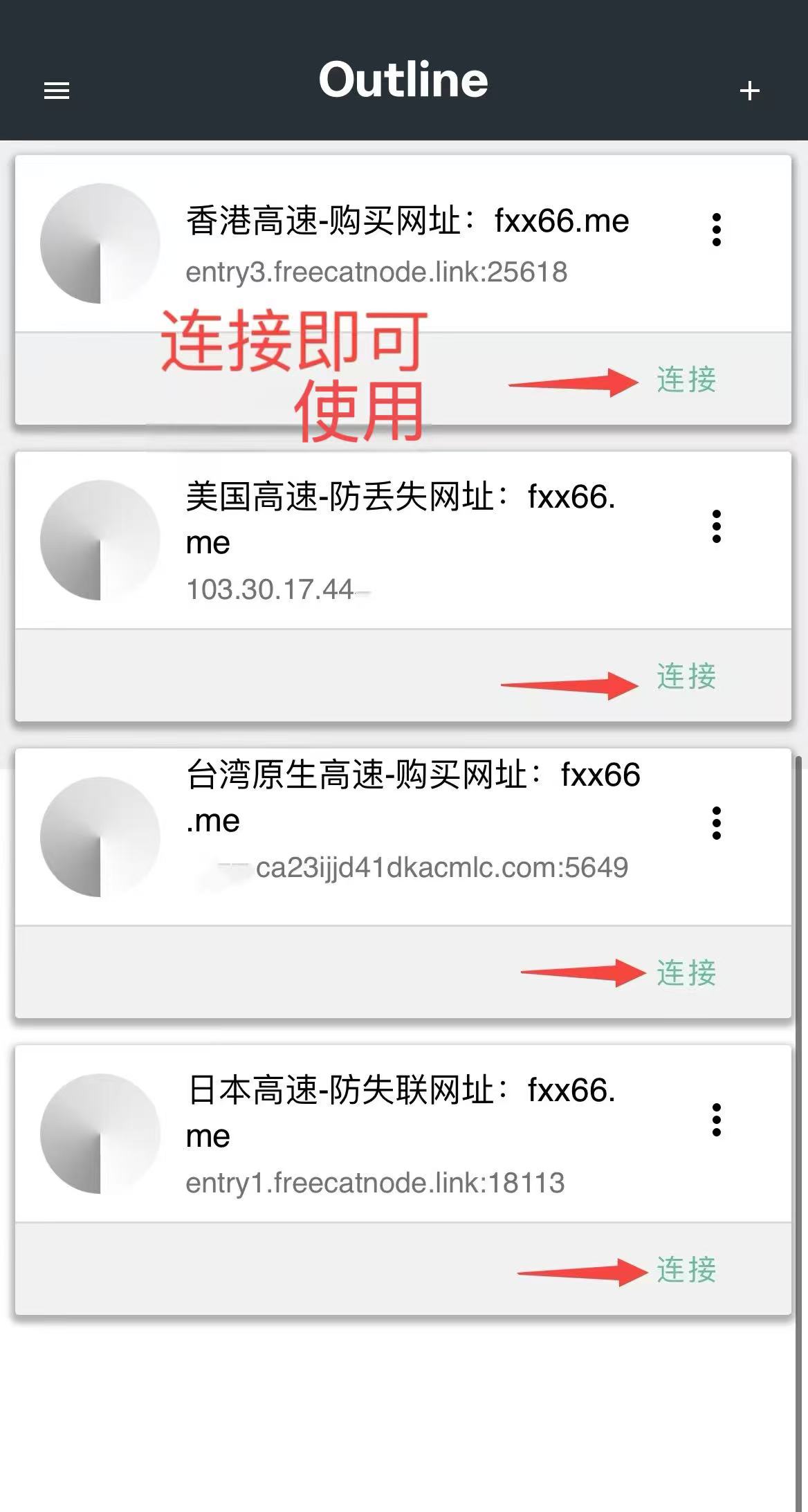 1:苹果,安卓,MacOS 。使用方法一致,下载好平台软件,获取服务器,然后将购买过的服务器逐个复制到outline里面即可!点击连接,马上开始全球互联之旅!(注意事项,本产品为了提高私密性,只能全局模式,浏览国内网站时,请断开连接!)